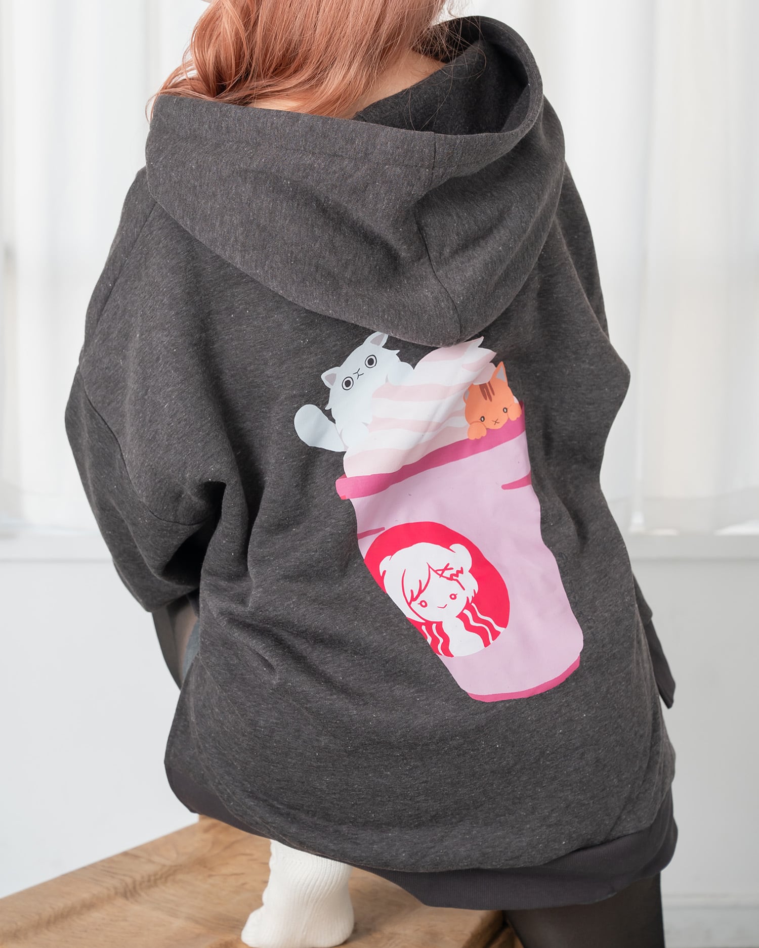 バックプリントデザインのパーカーは、リラックスしたい日にもぴったりなアイテムです。前と後ろは丈が違うデザイン!